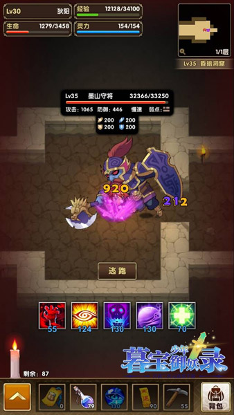 战斗为自动战斗。玩家只需要观察战斗状况,适时使用道具或技能即可,若是战斗情况不乐观,玩家也可以选择逃跑来保存生命。毕竟宝物或可贵,生命价更高。如果无法在墓室的迷宫中继续前行,玩家可以选择离开,在设置界面即可选择离开迷宫。但必须重点提醒的是,选择这种办法离开迷宫,那么玩家在进入墓室后的一切,都将随之失去,包括所得的经验、宝物、极品装备等等。