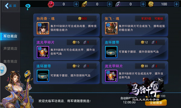 当英雄们拥有大量的声望和军功时,声望商店和军功商店便成为了英雄们的经常光顾之地。极品装备碎片、武将魂魄、进阶丹等道具奖励,只要你有足够声望和军功就能兑换。