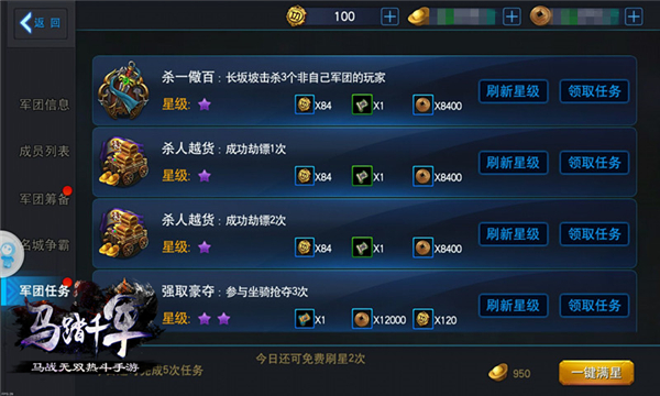 军功专属于各个军团内部,要在军团内部树立起自己的权威,没有大量的军功支持,可能有点说不过去。在《马踏千军》手游中,军功的建立需要英雄们坚持完成军团任务和参加军团争霸活动,并且海量的军团任务随时可以接取,实打实的军功来自战场上为军团的付出。