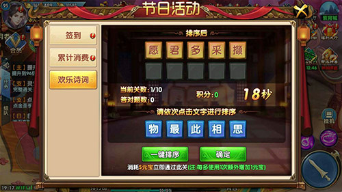 古人云:书中自有黄金屋,书中自有颜如玉。那么在高考之际,《紫青双剑》同样也要在游戏中下一下这方面的功夫。在活动期间玩家可以在“欢乐诗词”界面选择自己擅长的是“五言”还是“七言”,随后进入游戏界面,玩家根据提示来依次点击下方的文字组合成正确的诗词。玩家每答对一题都会获得绑定元宝、经验和积分的奖励,同时参加七言获得的积分会比五言的要多,同样难度也会增加,大家还是要谨慎选择。