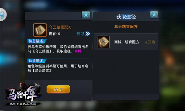 要获得最强力的战马,还是需要费一点点力气的。战马培育是你获得更高品质战马的极佳途径。通常获取战马配方之后,玩家还需收集到培育用的战马,才能培育出更高品质的战马。