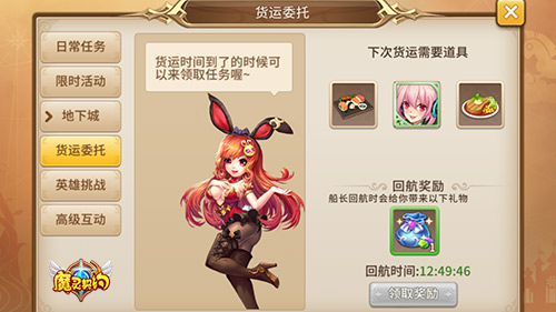 《魔灵契约》的货运委托任务为日常任务,达到一定等级后,玩家可在活动列表中开启活动。既然是货运委托,那么玩家自然需要准备相对应的货物。打开活动界面后,玩家将会看到本次出航所需要的物品,一般为英雄装备、药剂、变身卡以及食谱等。