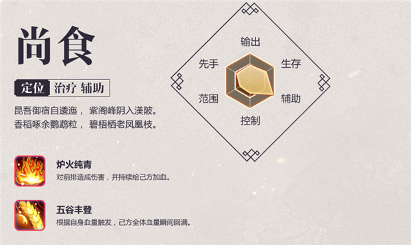 被动技能:五谷丰登,根据自身的血量触发,己方全体血量瞬间回满。