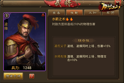 凌操,轻侠有胆气,早年跟随孙策征战,相当勇猛。其子凌统是吴国的名将,为人有国士之风,更是被陈寿赞誉为“江表之虎臣”,又是虎父无犬子的正面案例。游戏中父子两人一起上阵可以触发“凌氏父子”的组合技,增加15%的伤害,相对实用性就高了很多。
