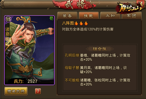 诸葛亮被誉为三国第一谋士,实力不容置疑。其子诸葛瞻聪慧过人,虽然难以比得上诸葛亮的,但诸葛瞻在绵竹之战中坚守战死,也算是忠烈。游戏中父子二人同为群体攻击武将,“八阵图”加“奇门遁甲”打野城肯定是不错的选择。