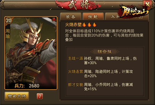 周瑜是东吴出众的军事家,孙家两大总裁孙策和孙权都对他赞赏有加。“谈笑间,樯橹灰飞烟灭”,羽扇纶巾的美周郎在赤壁上烧的一把火,直接烧伤了曹营势力的元气,也奠定了三分天下的大势。周瑜在游戏中同样是纵火高手,“火烧赤壁”的技能对全体目标造成伤害并灼烧两回合,还能与其他灼烧效果叠加,这就和另一位纵火高手完美配合了。