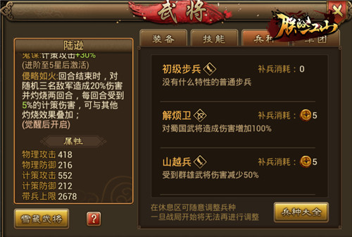 这另一位就是在周瑜病逝之后,接过东吴统兵大权的陆逊。他一生出将入相,统领吴国军政十余年,深得孙权器重,被赞为“社稷之臣”。在刘备以倾国之兵力为关羽报仇之时,陆逊漂亮的一把火轻松解除危机。游戏中的“火烧连营”同样能对全体目标造成伤害,并灼烧两回合,且能和其他灼烧效果叠加。