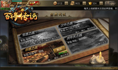 冰河游戏《百将传说》中,玩家可以在每周二、五、日期间的任意时段参与赤壁之战战役。玩家每天最多可进入2次战役,如果想多次进入战役则需要提升VIP等级并消耗元宝购买进入次数。赤壁之战战役中,玩家使用魏国意外的武将进入战役,并击杀所有敌对阵营敌人即可通关战役并领取海量奖励!