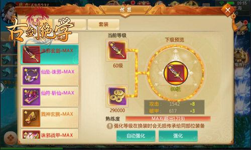 冰河游戏《古剑绝学》中,玩家开启炼器玩法后即可开始强化装备。游戏中,玩家只需消耗铜钱即可对装备进行强化,每次强化均会增加强化熟练度,熟练度满后即可提升至下一强化等级。强化等级会在换装时无损传承给同部位的装备,因此各位玩家更新装备后无需再次强化。随着玩家等级提升,装备可强化的等级还会不断提高,各位玩家想要将装备强化至MAX级,别忘记先升级哦!