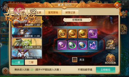 非酋抢BOSS,欧皇等BOSS,VIP则享受独家BOSS!在冰河游戏《古剑绝学》中,BOSS之家玩法是对VIP玩家及土豪玩家开启的专属场景,想要进入其中需要提升自身VIP等级或缴纳一定数量的元宝才行。此外,玩家在BOSS之家中击杀BOSS不增加疲劳值,只要玩家在场景内持续蹲守,即可斩获海量BOSS道具哦!