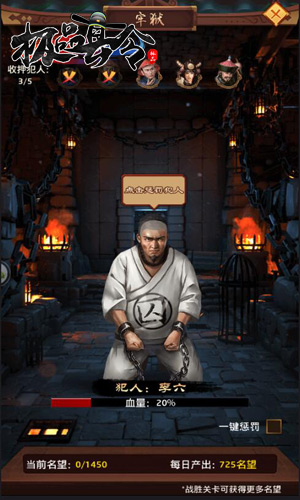 冰河《极品县令》中,随着玩家解锁关卡的数量增加,牢狱玩法自动开启。玩家可在关卡中抓捕各类犯人,之后即可在牢狱中消耗名望来惩罚犯人,获取各类奖励。玩家抓捕4名犯人之后还可解锁一键惩罚功能,消耗全部名望对犯人进行惩罚,快速获取各类资源讲理!随着玩家通关关卡增加,还可获取更高名望上限与更多每日名望,在牢狱中也能惩罚更多次犯人哦!