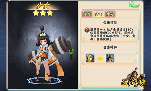 三套合体技能均能造成相当可观的伤害,值得注意的是,“至尊宝”+“唐僧”与“鬼牛王”+主角的合体技能共计能够削减敌方全员1000点的怒气值,这对于对手来说无疑是最致命的。