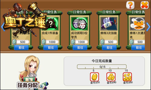 优戏网《奥丁之锤》中,玩家完成不同日常任务后可领取海量银币奖励,每日完成日常任务数量达到5、10、15次后,还可领取海量金币奖励哦!