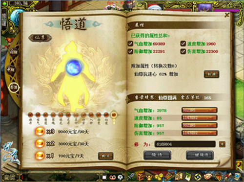 聚神、归宗至劫变,飞仙渡劫问道仙。“悟道系统”共分12劫境,每种境界又分初期、中期、圆满,不仅让你的“速度、气血、防御、伤害”全面加强,更有逆天附加属性让人可望而不可即。修为增加,让你战力火速提升!悟道奇经八脉,让PVP、PVE战斗没有不可能。