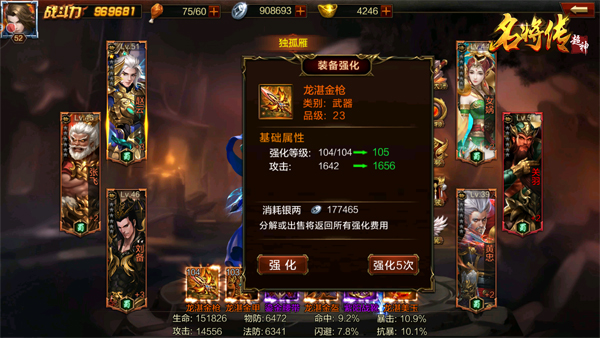 在《超神名将传》中,游戏角色的装备有武器、金甲、腰带、金盔、战靴、美玉六种,每种装备都能提升游戏角色的战力,都可以进行强化。玩家只需要消耗银两,就可以提升装备的强化等级,提升其属性,从而使玩家的战力得到大幅度提高。如果更换装备,也不必担心银两白白消耗,因为当玩家分解装备时,所消耗的银两会全部返还。
