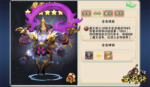 魔王怒火(合体技能):对敌方全员造成708%伤害并附带灼烧效果(150%),同时降低敌方25%命中,持续8秒。