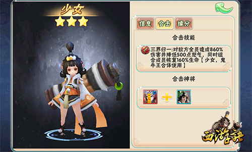 三界归一(合体技能):对敌方全员造成860%伤害并降低500点怒气,同时组合成员恢复160%生命。