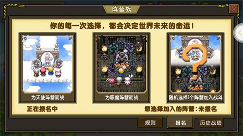 “艾斯爱露杰大陆”存在着善良正义的天使和邪恶黑暗的恶魔,每一个进入《像素大陆》的人们,体内都会封存着这两个截然不同的矛盾体,在阵营战开启的那一刻,人们可以选择自己所信仰的阵营,为自己的阵营而战斗,赢得战斗的胜利。阵营战报名时,可以选择天使阵营,或者是恶魔阵营,选择了阵营的玩家将会与敌对阵营的玩家进行万人大混战,直至一方全部阵亡,另一方则获得胜利,获得胜利的阵营的玩家,都可以获得丰厚的奖励,快来为自己喜爱的阵营战斗吧!
