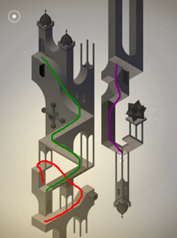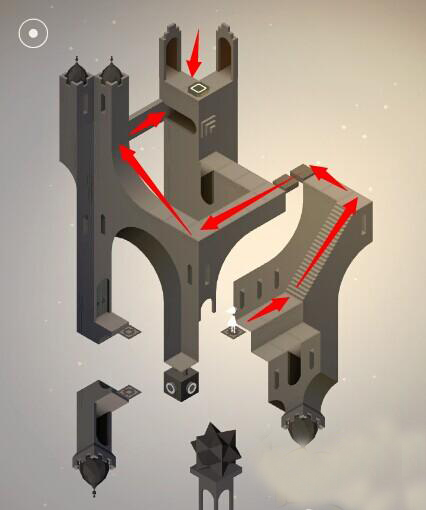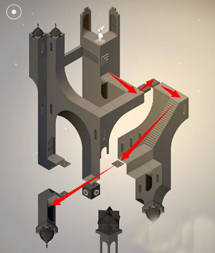 6、幻像城堡场景4,本关主要是利用中间方形的机关传送主角至目的地来通关。首先利用中间的方形让主角按照上图所画路线到达顶部,并启动顶部机关按钮。