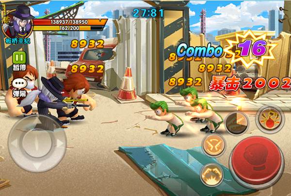 收拾完这群小喽喽,来到下一幕,工地深处,出现了两个红头发的彪形大汉,那是野原幽助的心腹,所以身边的小喽喽数量增加不小,记住,在进入下一幕的时候不要往上方走哦,不然就中了他们的陷阱了,被篮球砸到或者被彪形大汉的泰山压顶压到一下可是十分的痛呢,在这场战斗当中,小苍灵活的运用了我潇洒的走位,看到彪形大汉像山那样压向你的时候一定要注意躲避呢,别以为他们就会这一招,他们虽然块头大,但是还是非常灵活的呢,会以奇快的速度冲向敌人,配合上绿发小喽喽的篮球攻击和黄发小头目的花拳绣腿,简直是一个非常完美的阵型呢。先对付篮球小子,大块头和黄头发只会近身攻击,大家只要使用技能就能轻松的将他们滚进连招里。