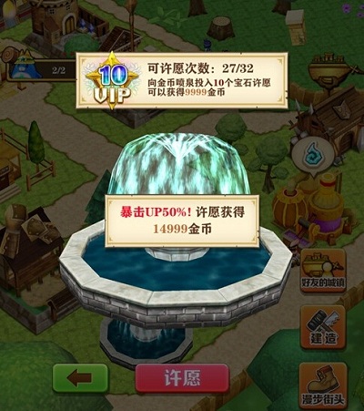 不同的VIP等级可许愿的次数和得到的金币是不一样的,并且在第四次许愿开始加成20%,第五次之后是50%。