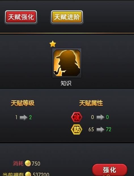 强化:天赋强化只消耗金币,天赋也会有相应的等级上限