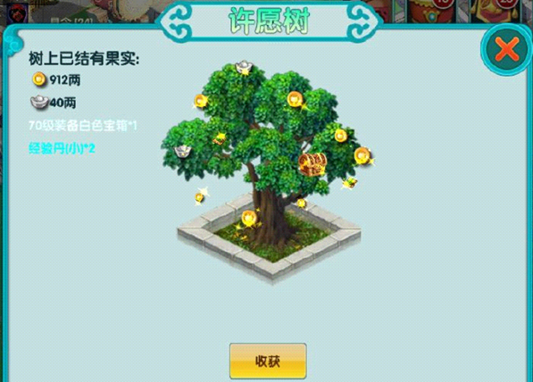 家在许愿树处点击可每天种植3次,每次种植成功后需要等待10分钟方能进行收获,收获时可获得大量银两和元宝。许愿树除了能种还能摘,每过一段时间会长出一些银两,玩家只要点击树上生长的银两便可获得不少银两。