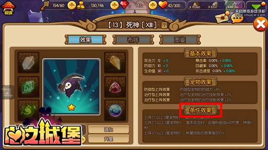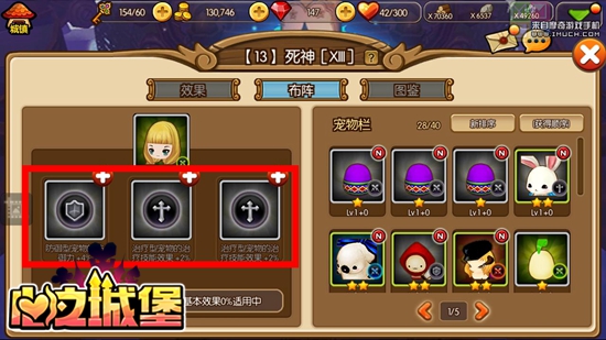 其实阵法不在多少,而在于使用是否得当,而萌宠搭配是否合理就是评价阵法使用是否得当的关键所在。上文提到,《心之城堡》不同的塔罗阵法能为团队提供不同的BUFF效果,这就要求大家在选择上阵宠物的时候三思而行,一定要让宠物的类型与阵法的BUFF类型一致。比如你用的是“死神”这一阵法,可以看到它的“宠物效果”是BUFF防御和治疗的。