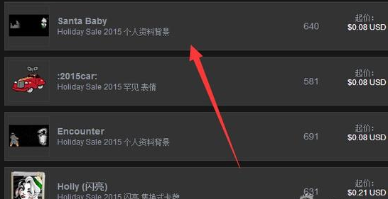 第一步:让我们进入STEAM冬季特惠的社区市场,这里有官方的表情、背景以及集换式卡牌,然后点击Santa Baby这个官方冬季特惠背景道具。