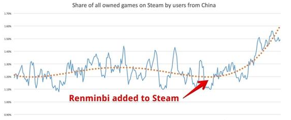 前两天,Steam宣布对网站服务器扩容,主力优化访问和下载速度,统计中还特别提到中国玩家的贡献。而据Steam Spy的最新图表,自去年1月4日人民币上线之后,Steam国区的游戏销量大增,目前激活用户约63万,居世界第五,平均每名用户拥有8.58款游戏。