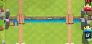 在你手上有这两张卡牌的时候,先放下猪,然后再迅速在你放猪的位置靠外一格放下另一个张卡,必须要快。若你在猪的放置时间没有结束之前放下了哥布林,那其中几个哥布林会把猪往旁边再挤一小格,这样的话你会看到你的猪直奔护卫塔。猪对应下图的红色框,另一张卡对应蓝色框,换到另一边就是镜像过去的位置。