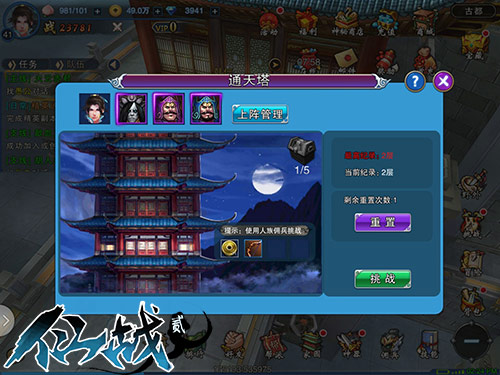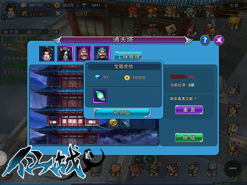 通天塔位于挑战系统,共有40层,每天可重置一次。玩家等级达到28级,才能开启该活动。从塔的第一层推门而入,按照顺序挑战,通过一层才可开启下层的挑战。宝塔40层,层层重兵把守,只有打败BOSS,才能获得经验、铜币奖励和随机掉落的神兵碎片。通关层数达到5、10、15、20、25、30、35、40时,还可以获得阶段性的神秘奖励。