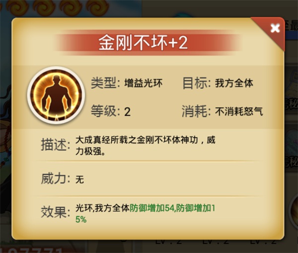 大成真经所记载的金刚不坏体神功,练就之后刀枪不入。被动效果可为己方提供一个增加防御的光环。