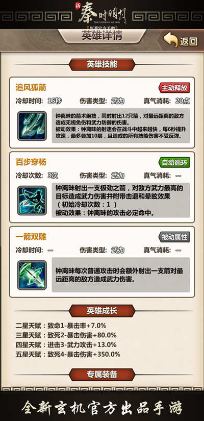 钟离昧,射术惊人的秦国都尉。原本出身自楚国,后因不明原因加入秦国的军队。为人正直,勇敢果断。被龙且猜测为楚南公所言的“传承兵家之道,象征风林火山”的四人其中的风。在我们《新秦时明月》当中,钟离昧也是非常强力的武力输出英雄。