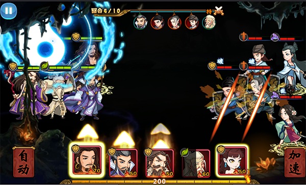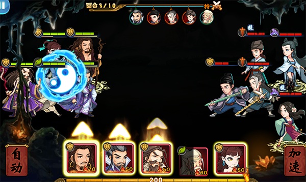 神话技能作为张三丰看家本领,技能效果十分强劲。被动效果是对血量低于一定值的己方侠客进行治疗。主动使用可以让横排的敌方侠客触发”破绽“效果。这时候如果配合杨公子的横排攻击(对“破绽”状态的目标造成额外的大量伤害),毁天灭地,逆转战局还真是不在话下。