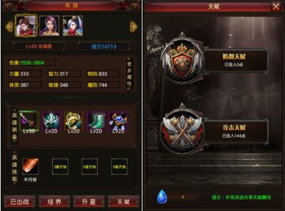 英雄天赋石可以在神秘商店,矿资源等地方获得。天赋分为攻击和防守天赋,仙友可根据实际情况培养。天赋可进行重置,该功能30级开启。