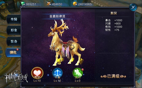 此外,新增坐骑驯化功能,玩家达到97级后可对坐骑进行驯化,驯化内容分为默契、平衡、灵巧,分别对应暴击、格挡、闪避三个属性。默契、平衡、灵巧各自分为10级,初始为0级,三项都到达10级后可进行领悟,领悟之后该坐骑的驯化就完成,可以驯化下一个坐骑,玩家能驯化的最高阶的坐骑就是当前自己的坐骑,驯化道具在丧尸玩法中产出。