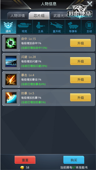 通用芯片作用于所有部队,因此只要提升通用芯片的属性,那么所有部队相应的属性都可得到提升。通用芯片属性有四种,分别于四大兵种相对应,坦克自带抗暴,特种兵自带闪避,直升机自带命中,导弹车自带暴击。因此,不同的兵种搭配都有可能出现意想不到的效果,真正体验了战场的瞬息万变!