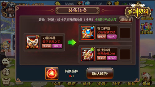 在《圣剑契约》中,如果说橙色套装是玩家个人实力的体现,那么红装就是需要运气才能入手的极品装备了。而有了本次更新的装备转化系统,玩家就可以利用“转化晶体”轻松完成装备属性转化,转化后装备还将集成全部强化等级,再也不用担心装备掉落不均衡的问题了。