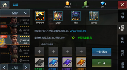 《钢铁雄狮》中,技能落叶导航释放之后首选推荐同CD技能“萨莫金”的“战场咆哮”,同为buff技能的“战场咆哮”满级能提高40%最终伤害且持续5秒,还有“魏特曼”11秒CD主动技“急速射击”提高全部载具射速50%且持续6秒。此三个buff叠加使用,能让全体坦克在开展后的第10秒至16秒打出一波超级爆发,瞬间完成战场逆转。