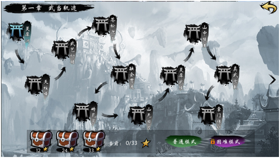 作为首款无职业水墨风武侠手游,《武当剑》采用了中国古典画作代表风格——水墨风作为主基调来诠释古代中国武侠的深意,在一票卡通、暗黑、重金属气息浓厚的游戏中脱颖而出,让人眼前不觉一亮。无论是俯瞰而下的武当整体架构还是巍峨延绵的青黛群山,就连锋极利刃的剑指、刀挥,都在泼墨而出的线条勾勒中显得尤为清秀利落。没有浓抹重彩,没有犀利的闪烁光泽,这就是《武当剑》浑然天成的水墨气韵。