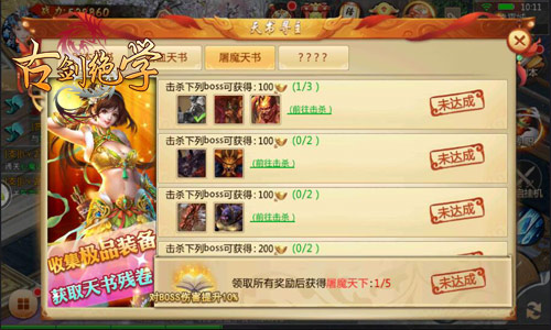 无字天书,才疏学浅之人参悟不透其中的奥秘,但是各位冰河游戏《古剑绝学》中修仙已久的玩家们便可通过各类日常任务参透无字天书,习得各类被动技能哦!各位玩家日常挂机、收集极品装备后,系统均会自动为玩家完成天书寻主任务,等待玩家完成全部任务后,即可轻松习得天书被动技能,增加海量战斗力哦!