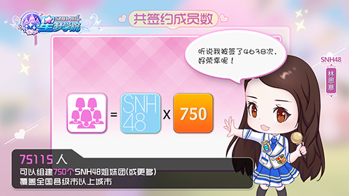 《星梦学院》中公演、工作、外务等玩法均离不开偶像们,所以多签约一些偶像准没错啦!梦想首测中,玩家们共签约了75115位偶像,其中“小黑龙”林思意被签约了4638次。这么多偶像,可成立至少750个SNH48姐妹团,覆盖全国县级市以上规模城市了!