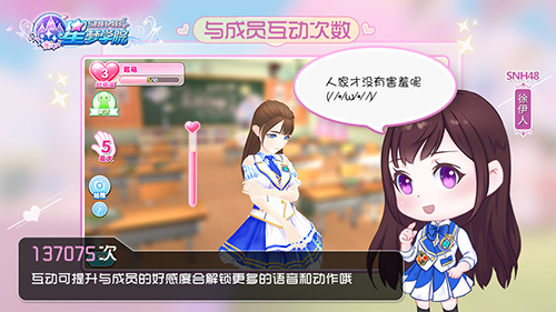 《星梦学院》中,玩家们可与SNH48偶像们进行“摸头杀”亲密互动,并提升好感度解锁更多语音和动作,想想就让人心动呐!梦想首测中,玩家共与成员进行了137075次互动,平均每位偶像被摸头6854次,真替她们的头发担心呐!