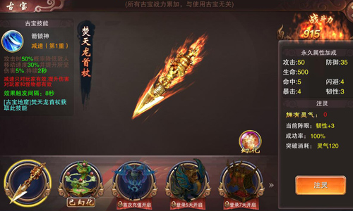 游戏中的各类古宝对于PVP玩家来说可是最完美的道具!每领悟一种古宝,即可获得一个单独属于该古宝秘藏的特殊技能,例如焚天龙首杖拥有减速技能,攻击时有概率降低敌人移动的速度,并提升对敌人的伤害。真金龙王铠拥有眩晕技能,攻击时有概率令敌人眩晕,持续一定时长。罚天火神臂拥有流血技能,攻击时有概率令敌人在一定时间内进行扣血。