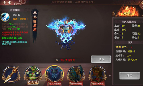 此外,每一个古宝都可以永久增加人物角色的属性,获得的古宝秘藏越多,增加的属性当然就越高哦!而不同的古宝秘藏也会拥有不同的场景表现,越高级的古宝秘藏场景表现更酷炫,更华丽。