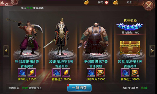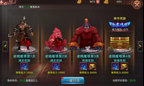 磨难过后,才能收获胜利的果实。通过凌烟魔塔每一关怪物的强力防御,才可获得丰厚的奖励:进阶丹、资质丹、装备强化石、绑定元宝卡、经验等奖励等你来拿!