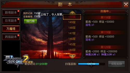 福利系统之外,副本系统则是另一大玩家们每天都可以不需要战斗,便能领取奖励的地方。剧情副本、日常副本、万魔塔、跨服副本的一键扫荡,让已然通过挑战的玩家们,每天只需要轻轻一点,便能将资源道具尽收囊中。