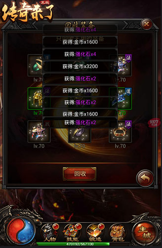 而在9377《传奇来了》当中,通过特色的装备回收系统玩法,勇士强者们可以获得金币以及强化石这两大收益。回收的装备等级品质越高,能够获得的金币和强化石收益就越多!