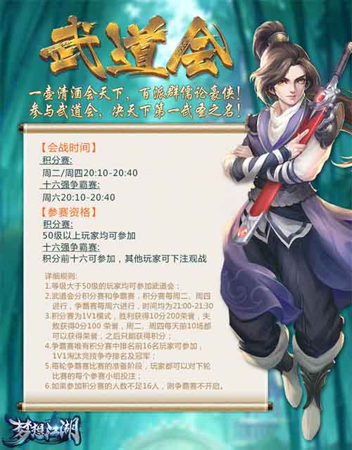 每届武道会有三场比赛,周二、周四21:00-21:30进行积分赛,积分前十六的玩家入选周六21:00-21:30的争霸赛,逐级淘汰,战到最后,方可获得至尊“武圣”的称号。